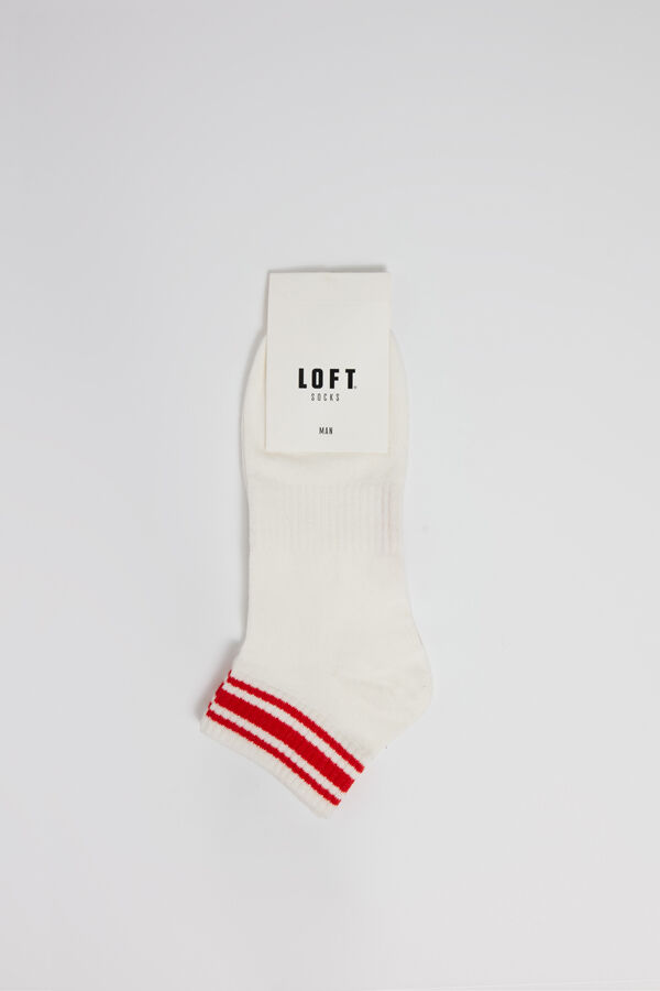 Bu beyaz çoraplar, bilek kısmındaki yatay çizgilerle hareketleniyor. Yumuşaklığıyla gün boyu ayaklarını rahat ettirirken, nefes alabilir yapısıyla da terlemeyi önler.