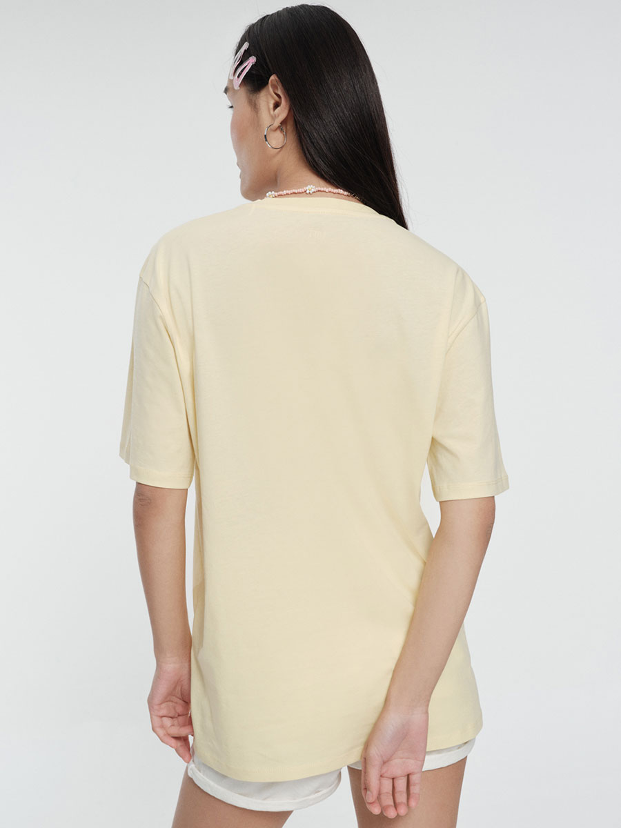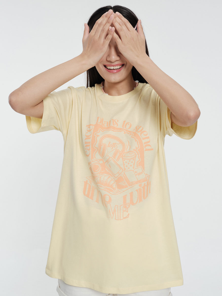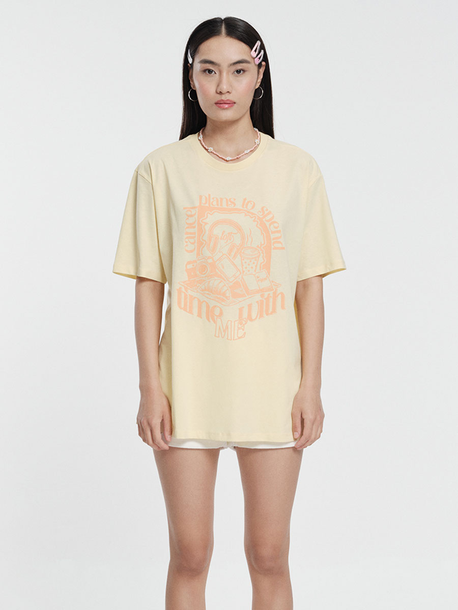 Bu kısa kollu, bisiklet yakalı tişört, Loose Fit tasarımıyla vücudunuzu sarıp sarmalıyor, özgürlüğünüze yeni bir boyut katıyor. %100 pamuktan üretildiği için nefes alabilir ve gün boyu yumuşaklığını koruyor; dayanıklı yapısı ise uzun süreli kullanım vaat ediyor. Açık sarı renkli tişörtün ön tarafındaki, şeftali renginde "Can't plans to spend time with ME" yazısı ve eğlenceli illüstrasyonlar günlük tarzınıza eğlenceli bir hava katıyor.