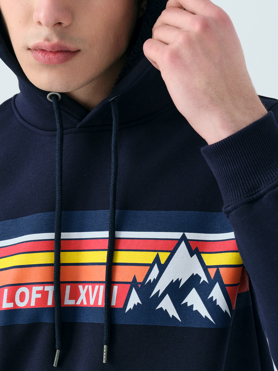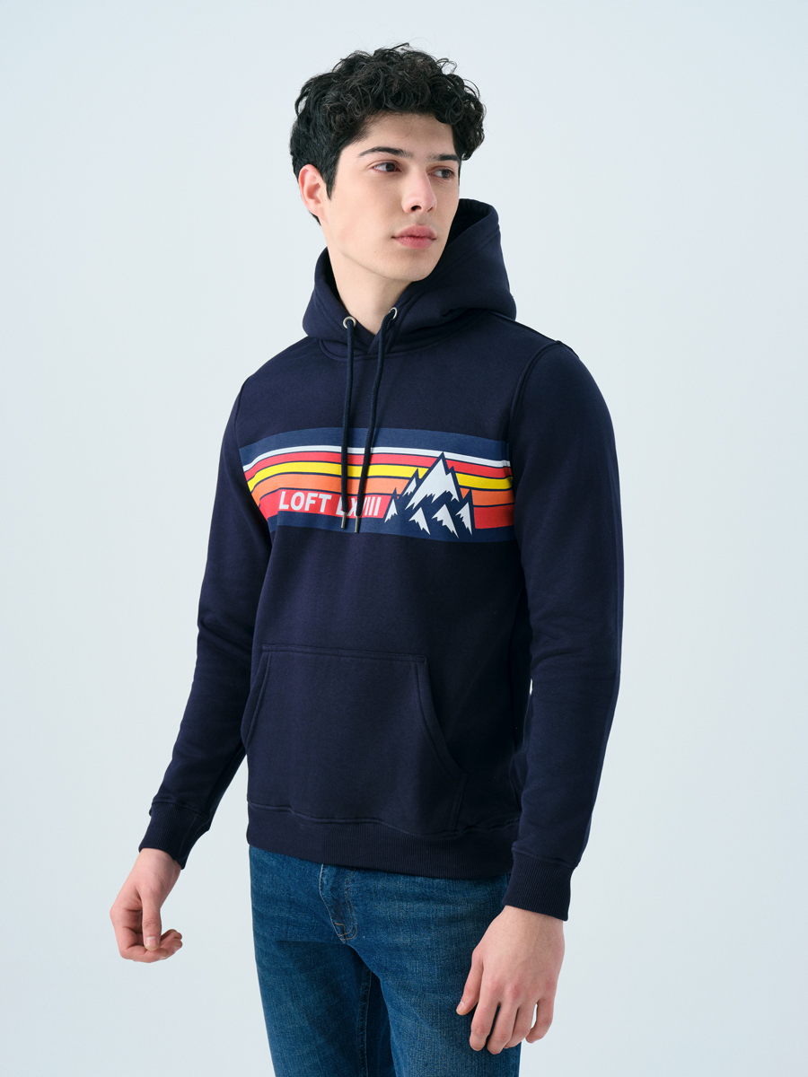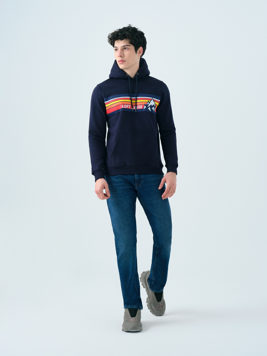 Lacivert sweatshirt'ün regular fit kesimiyle rahatlığı yakala, kapüşonlu stilinle havana hava kat. Göğsündeki yatay şeritler, marka logosu ve dağ silüeti, casual ve sportif ruhunu yansıtırken uzun kollarıyla serin havalarda bile tarzından ödün verme. Bu sweatshirt, enerjik duruşuyla her ortamda dikkatleri üzerine çekecek.