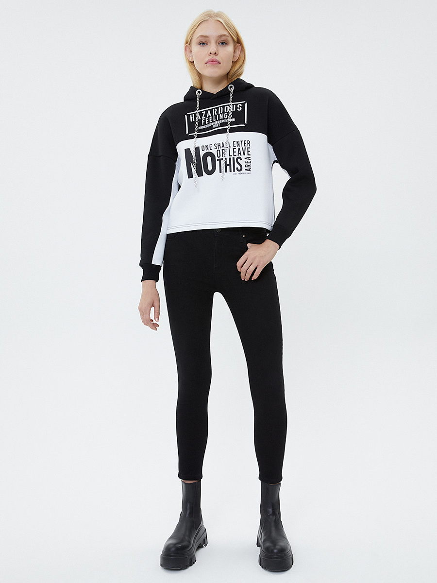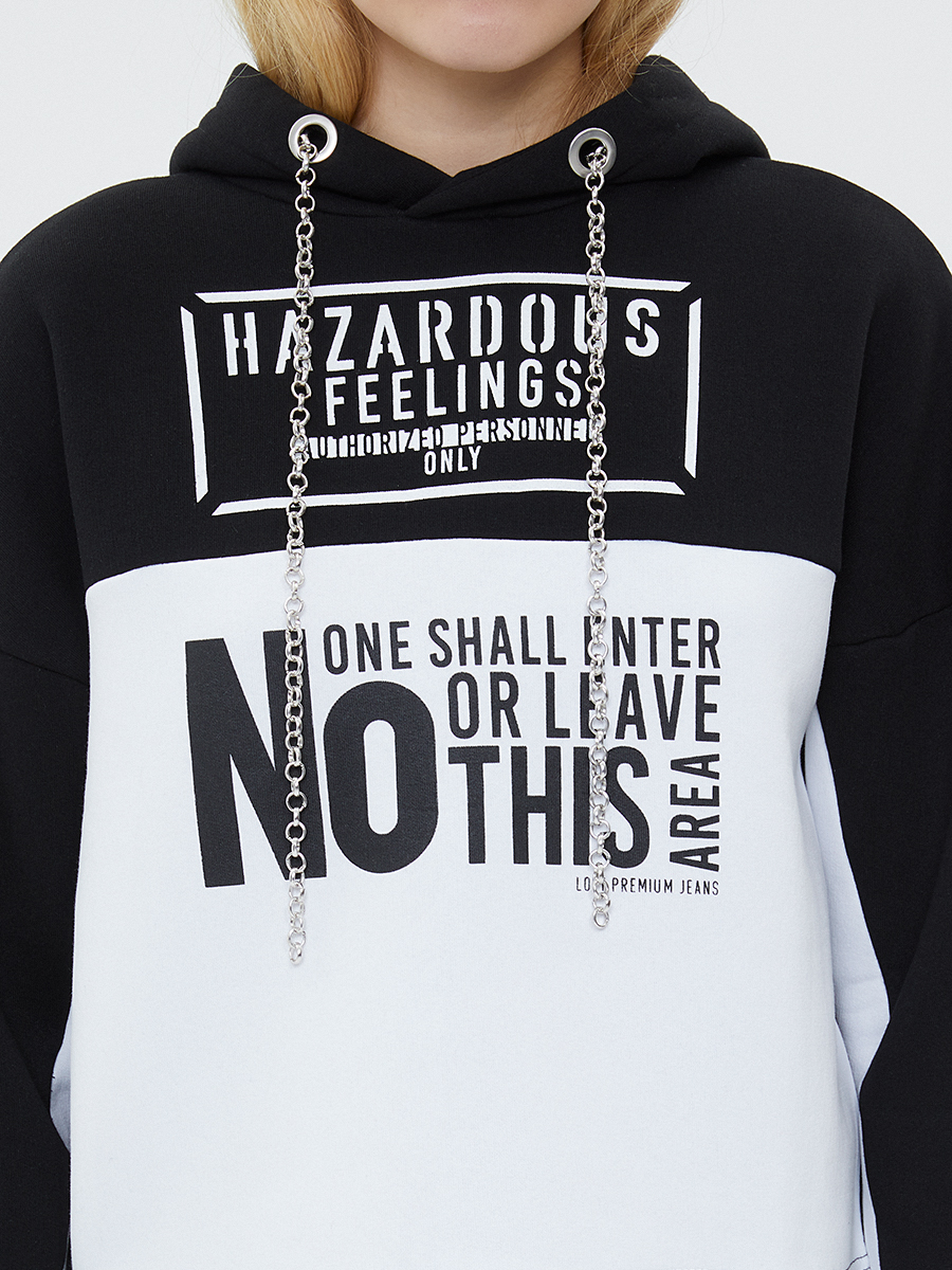 Uzun kollu, kapüşonlu sweatshirt'ümüzle sokak stilini yeniden tanımlayın. Regular Fit duruşuyla vücudunuzu sarıp, özgürlüğünüzü kutlar. Dayanıklı ve nefes alan kumaşıyla her anınızda rahatlığı yakalayın, yumuşak dokusuyla teninizde dans edin. Siyah ve beyaz renk bloklarından oluşan panele, metal zincirlerle işlenmiş "HAZARDOUS FEELINGS" gibi yazılar, günlük stilinize meydan okuyan bir dokunuş katıyor.