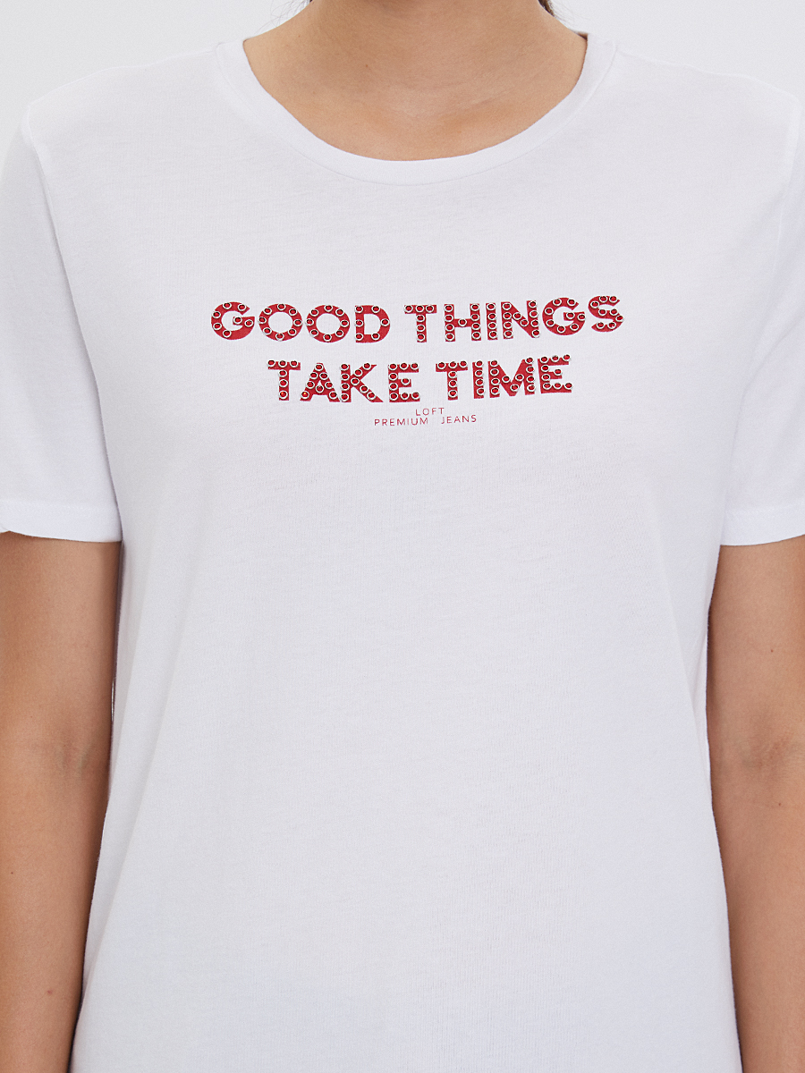 Bu tişört, kısa kollu, bisiklet yakalı ve Regular Fit duruşuyla vücudunuza kusursuz bir şekilde oturuyor; %100 pamuktan üretilen yapısı, gün boyu nefes alabilirlik ve yumuşaklık sunuyor. Üzerindeki “GOOD THINGS TAKE TIME” yazısı ve kırmızı noktalı desen, günlük casual stilinizi taçlandırıyor, her adımınıza eşsiz bir enerji katıyor.